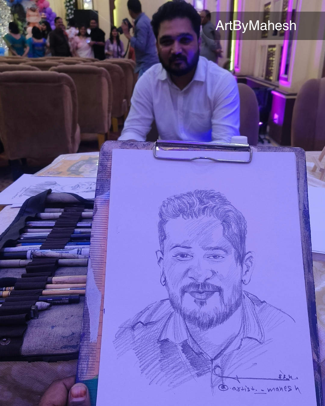 ArtByMahesh offers a personalized artistic experience where guests can watch their portraits come to life in real-time, creating a unique and interactive memory that lasts forever.